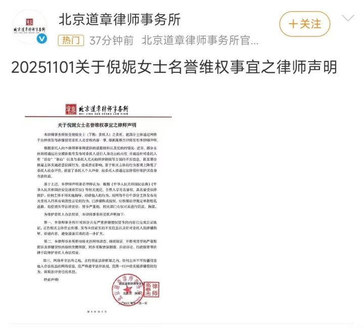 面对谣言,倪妮工作室反应很快,11月1日,就发了律师函维权。