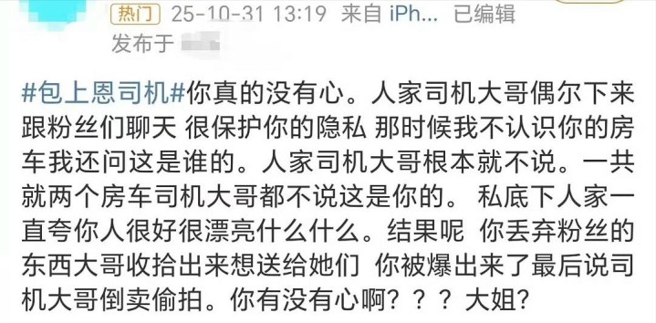 但反转来得很快。现场粉丝和知情人站出来反驳:这些东西是包上恩团队转场时丢在车里的 “破烂”,司机只是觉得扔了可惜,想拍照问粉丝要不要,根本没打算卖。